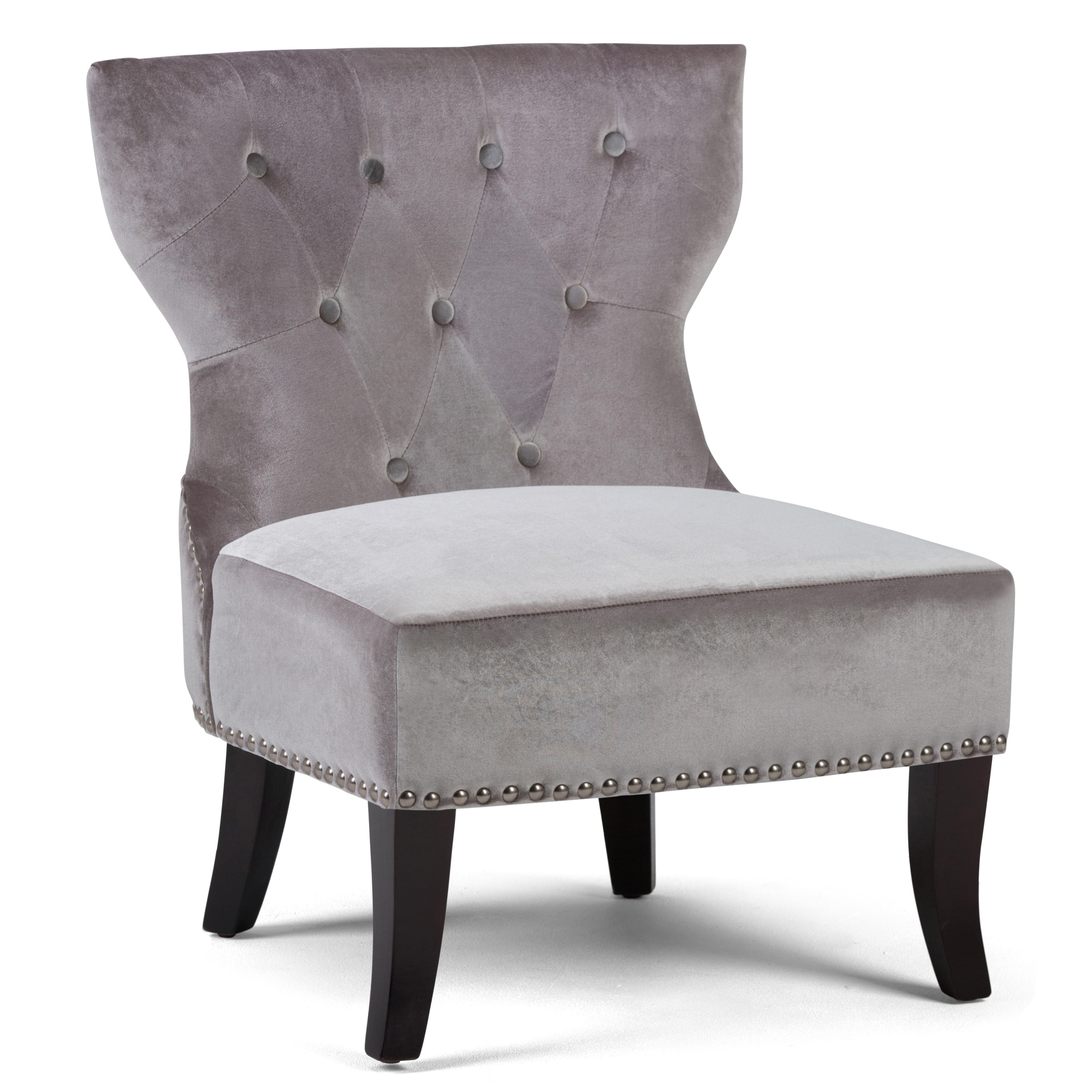 The grey velvet fabric and dramatic tufting with nail heads give this accent chair a luxurious look while the richness of the dark brown wood provides a.